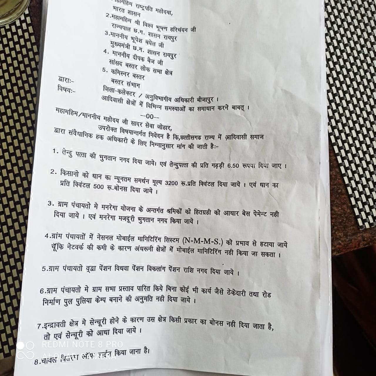 आदिवासी समाज के बैनर तले अपनी आठ सूत्रीय मांगों को लेकर सौपे गये ज्ञापन में तेंदूपत्ता की राशि में बढ़ोत्तरी, धान के समर्थन मूल्य में बढ़ोत्तरी, मनरेगा भुगतान नगद करने, वृद्धावस्था, विधवा व विकलांग पेंशन नगद करने, ग्राम पंचायतों में ग्राम सभा प्रस्ताव पारित किये बिना कोई भी कार्य जैसे ठेकेदारी तथा सडक़ निर्माण, पुल पुलिया कैम्प बनाने की अनुमति नहीं दिया जाए। ग्राम पंचायतों में नेशनल मोबाइल मॉनिटरिंग सिस्टम(एनएमएमएस) को प्रभाव से हटाया जाए। इंद्रावती क्षेत्र में सेंचुरी होने के कारण उस क्षेत्र में किसी प्रकार का बोनस नहीं दिया जाता हैं, सेंचुरी को आधा दिया जाए तथा चांवल वितरण ऑफ लाइन किया जाए।
