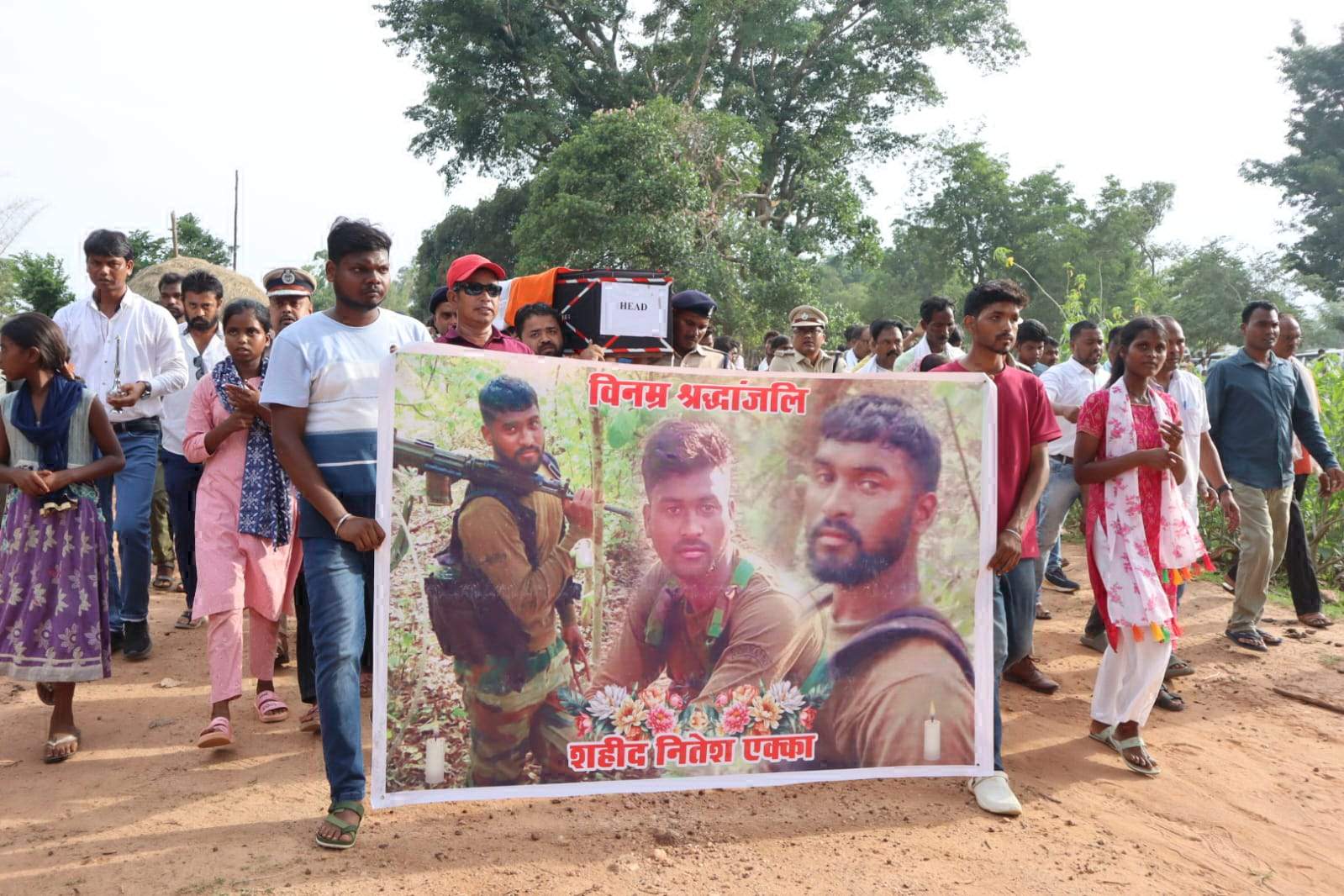 शुक्रवार को नारायणपुर जिले के अंतर्गत ओरछा में हुए मुठभेड़ में नक्सलियों से लोहा लेते हुए जशपुर के ग्राम चराईडाँड़ की माटी के लाल आरक्षक नितेश एक्का शहीद हो गए थे। जिसके बाद आज सर्वप्रथम राजधानी रायपुर स्थित चौथी बटालियन माना में प्रदेश के मुख्यमंत्री विष्णुदेव साय, उपमुख्यमंत्री विजय शर्मा सहित अन्य नेताओं ने शहीद जवान नितेश एक्का को पुष्प अर्पित कर अपनी विनम्र श्रद्धांजलि दी और पार्थिव शरीर को कांधा दिया। इस दौरान मुख्यमंत्री विष्णुदेव साय ने कहा कि यह शहादत व्यर्थ नहीं जाएगी, हम नक्सलियों का खात्मा होने तक चुप नहीं बैठेंगे।