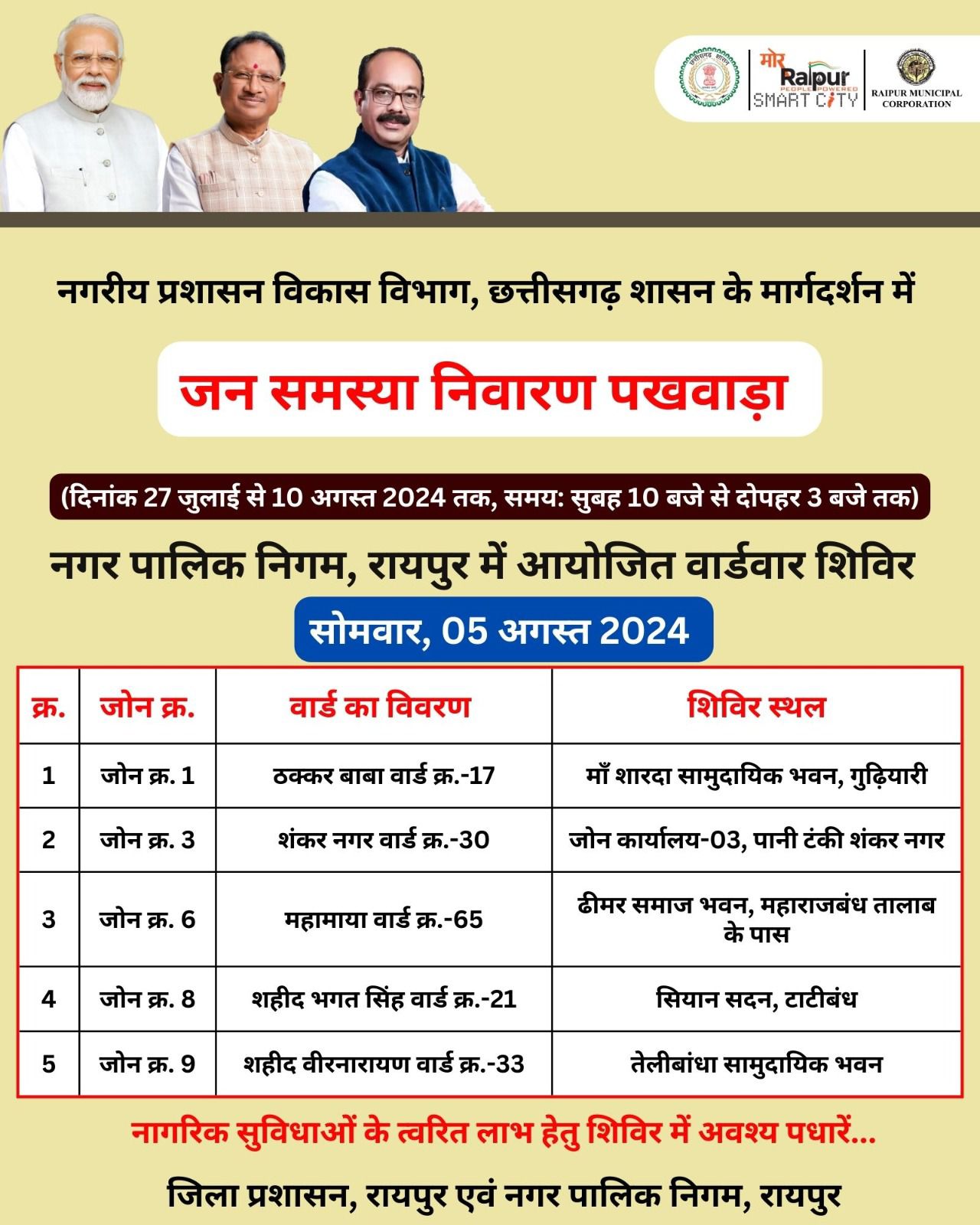 उन्होंने कहा कि छत्तीसगढ़ की सरकार जनता के प्रति जवाबदेह सरकार है। हमने छत्तीसगढ़ को बनाया है और हम ही इसे संवारेंगे। उन्होंने वार्ड के विकास के लिए एक करोड़ रुपए देने की घोषणा की। श्री साव ने कहा कि छत्तीसगढ़ सरकार द्वारा चलाए जा रहे जनसमस्या निवारण का नागरिकों की ओर से भरपूर समर्थन मिल रहा है। लोग अपनी समस्या को लेकर शिविर में पहुंच रहे है और उनकी समस्याओं का सुचारू रूप से निराकरण हो रहा है। नगर निगम सहित किसी भी विभाग की समस्या हो, सभी का निराकरण एक ही जगह पर किया जा रहा है। इससे आम जनता को बड़ी राहत मिल रही है।