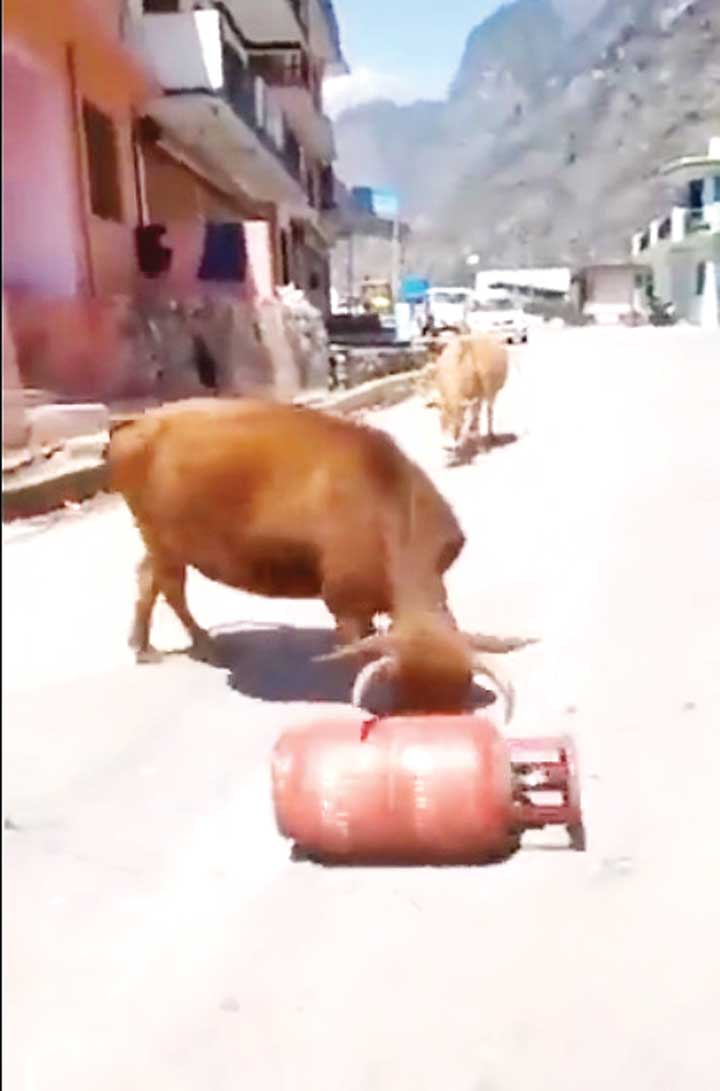 घरेलू गैस सिलेंडर के दाम में 200 रुपये की कमी करने की घोषणा के बाद सोशल मीडिया पर तरह-तरह की प्रतिक्रियाएं आ रही हैं। एक वायरल वीडियो में गाय काफी देर तक सिलेंडर को लुढक़ाकर सडक़ पर खेल रही है। टिप्पणी की गई है कि गौमाता सिलेंडर सस्ता होने पर खुशी जाहिर कर रही है।