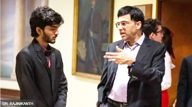 ग्रैंडमास्टर विश्वनाथन आनंद (दाएँ) के साथ गुकेश दोम्माराजू