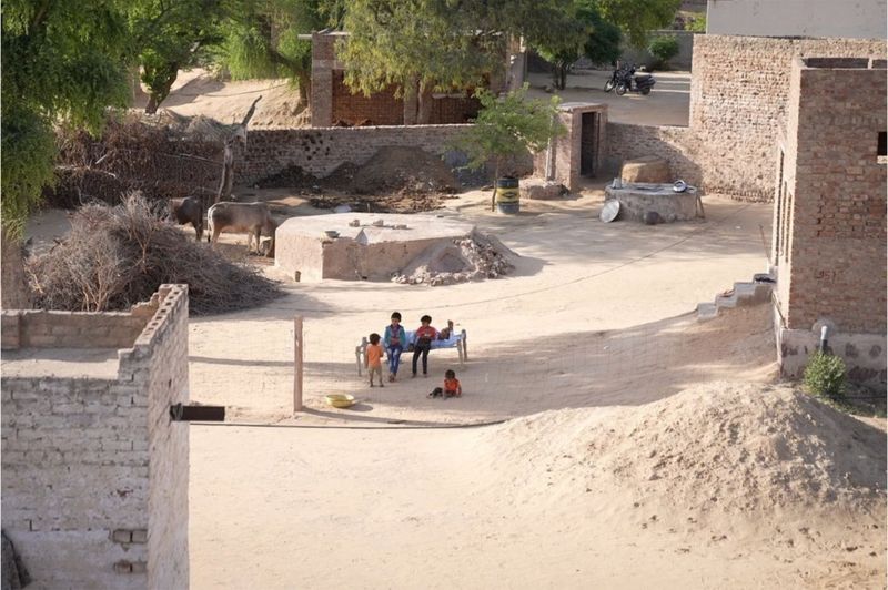 दूर तक दिखते खेतों और रेत के टीलों के बीच बसा ये गांव देखने में समृद्ध लगता है. यहां की ख़ामोश गलियों के इर्द-गिर्द बने बड़े मकानों के ऊपर सैटेलाइट डिश एंटीना और पानी की टंकिया नज़र आती हैं.
