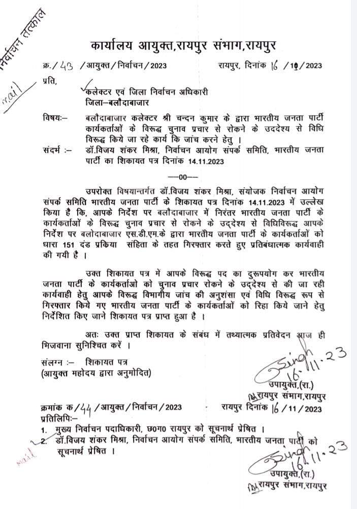 जारी आदेश में भाजपा निर्वाचन आयोग संपर्क समिति के संयोजक डॉ. विजय शंकर मिश्रा द्वारा गत दिनों भारत निर्वाचन आयोग नई दिल्ली और मुख्य निर्वाचन पदाधिकारी कार्यालय रायपुर को दी गई। शिकायत का उल्लेख है जिसमें उन्होंने आरोप लगाया था कलेक्टर चंदन कुमार ने धारा 151 के तहत प्राप्त शक्तियों और पद का दुरुपयोग किया है। साथ ही भाजपा के प्रचार को रोकने की कोशिश की है।