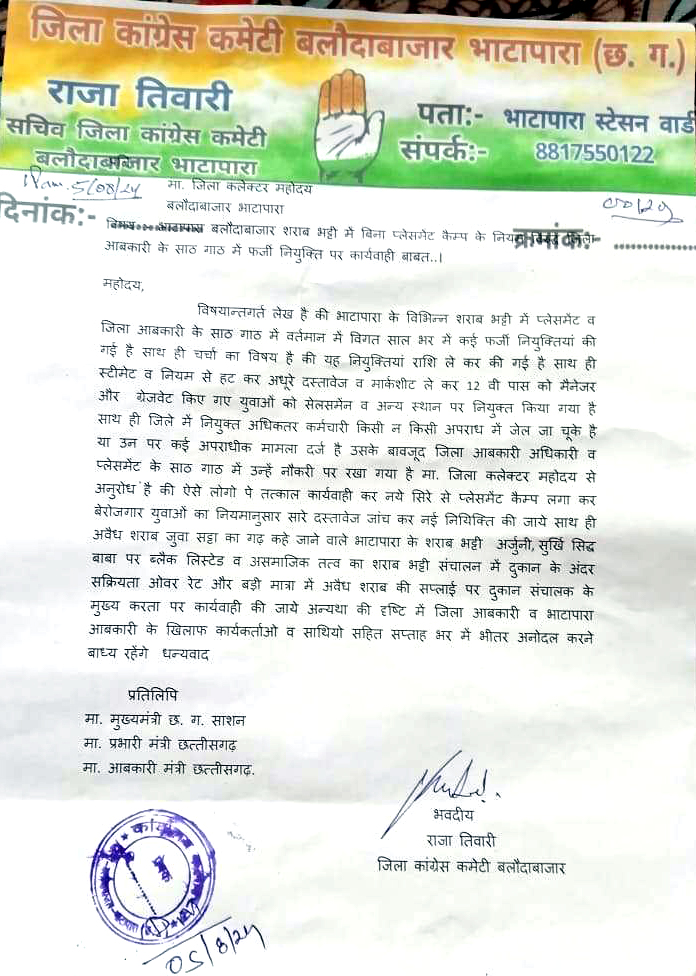 राजा तिवारी ने कहा कि भाटापारा बलौदा बाजार जिले में नियम विरुद्ध लगातार बिना प्लेसमेंट कैम्प व ईश्तहार के शराब दुकान संचालन हेतु फर्जी तरीके से नियुक्तियां की है, वहीं कई कर्मचारी ऐसे है, जो 12वीं पास नहीं है, और इन्हें सुपरवाइजर के स्थान पर नियुक्त किया गया है, और कई ऐसे है जो या तो आदतन अपराधी है या ब्लैक लिस्टेट हंै, उनके भरोसे दुकान संचालित करवाया जा रहा है। साथ ही कुछ लोग ऐसे भोले भाले युवा हैं, जिनके नाम सेल्समेन व सुपरवाइजर के नाम से दर्ज है। पर उनसे पुठ्ठा सीसी उठवाई जाती है, और दो-चार पैसे नाम मात्र के दिए जाते है, और उनके सेल्समैन के पद अनुसार वेतन उठाई जा रही है और स्वयं प्लेसमेंट के द्वारा उसे आहरण किया जा रहा है।