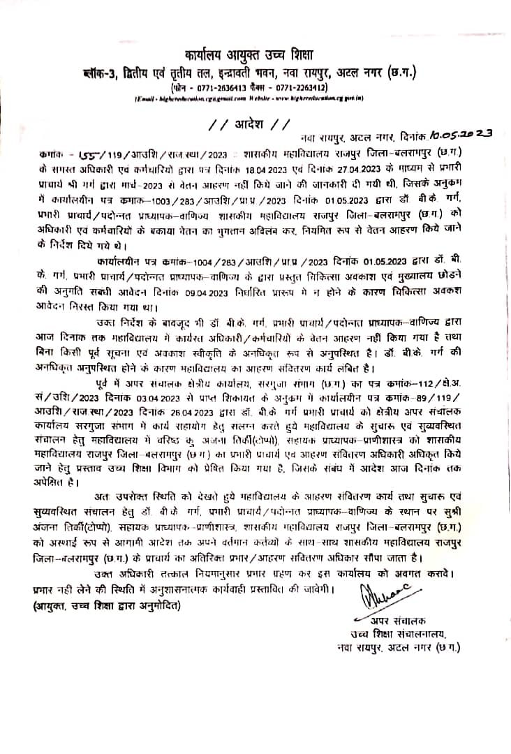 आदेश में कहा गया कि डॉ. बी. के गर्ग के द्वारा प्रस्तुत चिकित्सा अवकाश एवं मुख्यालय छोडऩे की अनुमति संबंधी आवेदन दिनांक 8 अप्रैल 2023 निर्धारित प्रारूप में न होने के कारण चिकित्सा अवकाश आवेदन निरस्त किया गया था।उक्त निर्देश के बावजूद भी डॉ. बी के गर्ग द्वारा आज दिनांक तक महाविद्यालय में कार्यरत अधिकारी कर्मचारियों के वेतन आहरण नहीं किया गया है तथा बिना किसी पूर्व सूचना एवं अवकाश स्वीकृति के अनधिकृत रूप से अनुपस्थित है।डॉ. बी के गर्ग की अनधिकृत अनुपस्थित होने के कारण महाविद्यालय का आहरण वितरण कार्य लंबित है। पूर्व में अपर संचालक क्षेत्रीय कार्यालय सरगुजा संभाग का पत्र क्रमांक- 112 / क्षे.अ.सं/ उशि / 2023 दिनांक 03.04.2023 से प्राप्त शिकायत के अनुक्रम में कार्यालयीन पत्र क्रमांक 89/119/ आउशि/राज.स्था / 2023 दिनांक 26.04.2023 द्वारा बी.के. गर्ग प्रभारी प्राचार्य को क्षेत्रीय अपर संचालक कार्यालय- सरगुजा संभाग में कार्य सहायोग हेतु संलग्न करते हुये महाविद्यालय के सुचारू एवं सुव्यवस्थित संचालन हेतु महाविद्यालय में वरिष्ठ अंजना तिर्की (टोप्पो) सहायक प्राध्यापक-प्राणीशास्त्र को शासकीय महाविद्यालय राजपुर जिला बलरामपुर का प्रभारी प्राचार्य एवं आहरण संवितरण अधिकारी अधिकृत किये जाने हेतु प्रस्ताव उच्च शिक्षा विभाग को प्रेषित किया गया है.जिसके संबंध में आदेश आज दिनांक तक अपेक्षित है।