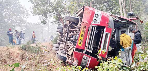 जानकारी के मुताबिक़ मंगलम टूर एंड ट्रेवल्स की बस तीर्थयात्रियों को लेकर अयोध्या और वाराणसी में दर्शन करने के लिए जा रही थी, तभी बस खरहरा नदी के मोड़ पर अनियंत्रित होकर सडक़ किनारे पलट गई और दुर्घटना ग्रस्त हो गई। हादसे के दौरान बस में करीब 42 तीर्थ यात्री सवार थे, इनमें 15 तीर्थयात्रियों को चोटें आई हैं। घायलों का इलाज वाड्रफनगर सिविल अस्पताल में जारी है। ज्ञात हो कि ठंड के मौसम में सुबह के समय घना कोहरा छाया हुआ रहता है, सडक़ पर कुछ भी स्पष्ट दिखाई नहीं देता जिसके चलते वाहन चालकों को परेशानी होती है।