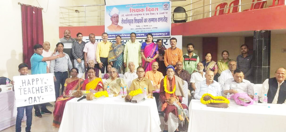 जगदलपुर, 6 सितम्बर। शिक्षक दिवस पर गुरूवार को नगर पालिक निगम में वरिष्ठ गुरुजनों का समारोह पूर्वक सम्मान किया गया। नगर निगम सभा कक्ष में आयोजित सम्मान समारोह में शहर के सेवानिवृत्त शिक्षकों को शाल, श्रीफल भेंट कर महापौर व पार्षदों ने सम्मानित करते हुये उनका आशीर्वाद लिया। नगर निगम द्वारा प्रथम बार गुरूजनों का सम्मान कार्यक्रम किया गया है।