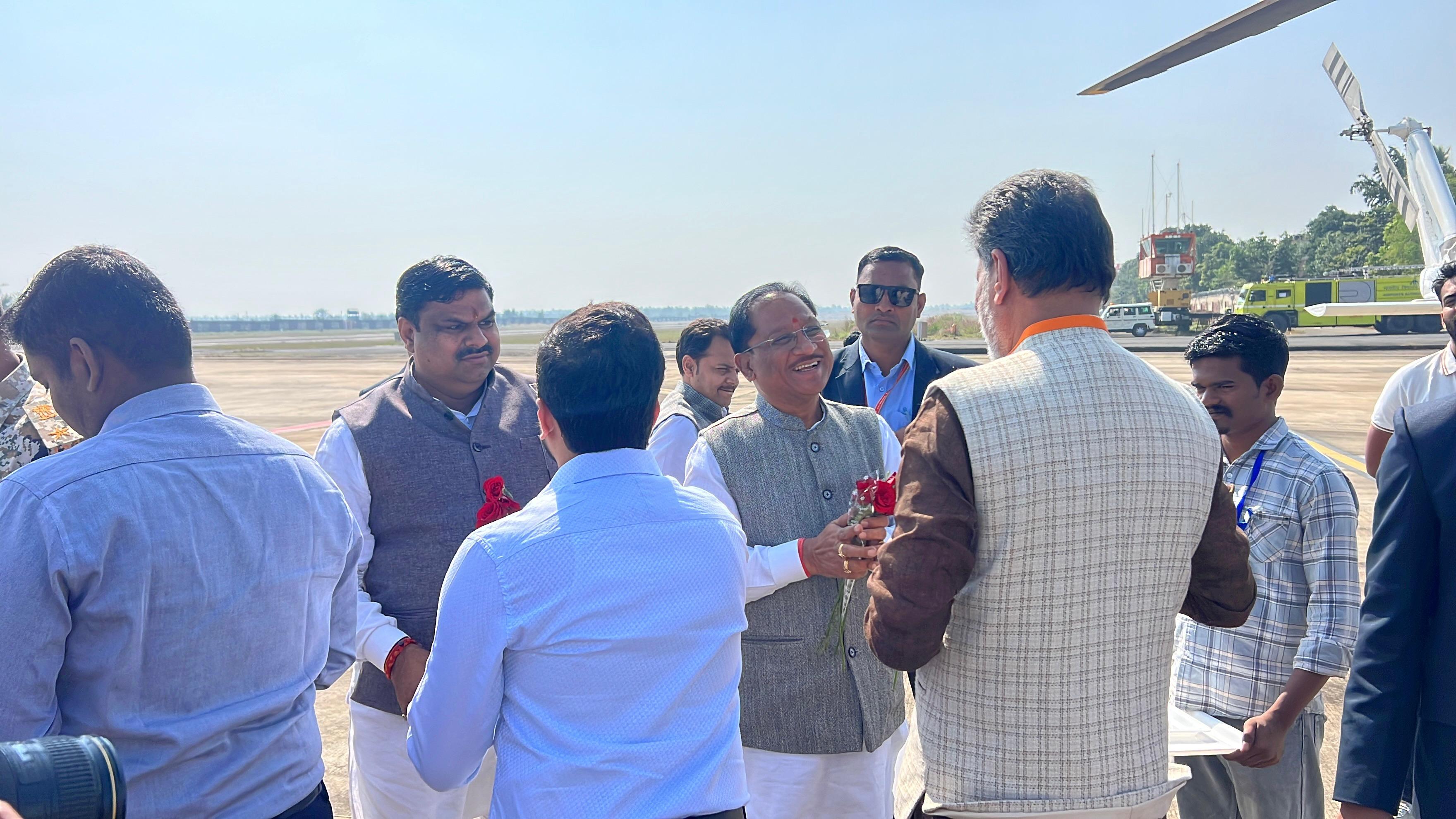 हवाई अड्डे पर छत्तीसगढ़ बेवरेज कॉर्पोरेशन अध्यक्ष श्रीनिवास राव मद्दी, छत्तीसगढ़ राज्य अनुसूचित जनजाति आयोग अध्यक्ष रूप सिंह मंडावी, नगर निगम सभापति खेमसिंह देवांगन, पूर्व सांसद, पूर्व विधायक, नगर निगम के एमआईसी के सदस्य सहित अन्य जनप्रतिनिधियों, आईजी सुंदरराज पी., कमिश्नर डोमन सिंह, कलेक्टर हरिस एस, पुलिस अधीक्षक शलभ सिन्हा, सीईओ जिला पंचायत प्रतीक जैन सहित अन्य अधिकारी ने स्वागत किया।