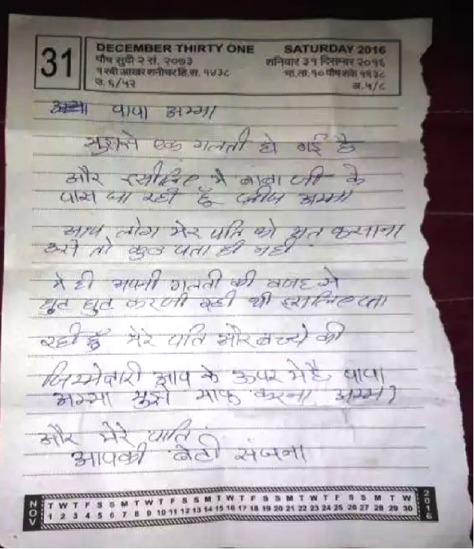 उन्होंने देखा कि दूसरे कमरे में संजना फांसी पर लटकी हुई है। सूचना मिलने पर पहुंची पुलिस ने फंदा उतारकर अस्पताल पहुंचाया लेकिन डॉक्टरों ने उसे मृत घोषित कर दिया। कमरे की तलाशी ली तो एक पुरानी डायरी के पन्ने में संजना कुमारी का सुसाइड नोट मिला, जिसे उसने पापा और अम्मा को संबोधित करते हुए लिखा है कि मुझसे एक गलती हो गई है और इसीलिए मैं बाबाजी के पास जा रही हूं। आप लोग मेरे पति को मत फंसाना, उसे तो कुछ भी पता नहीं। मैं ही अपनी गलती की वजह से घुट-घुट कर जी रही थी, इसलिए जा रही हूं। मेरे पति और बच्चे की जिम्मेदारी आप के ऊपर में है। मुझे माफ कर देना।