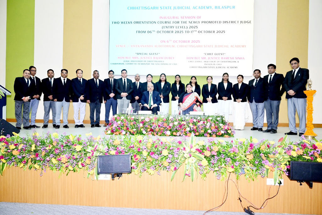 बिलासपुर, 7 अक्टूबर। छत्तीसगढ़ राज्य न्यायिक अकादमी, बिलासपुर के विवेकानंद सभागार में सोमवार से नव पदोन्नत जिला न्यायाधीश (प्रवेश स्तर) 2025 के लिए दो सप्ताह का प्रशिक्षण कार्यक्रम शुरू हुआ। कार्यक्रम का उद्घाटन छत्तीसगढ़ उच्च न्यायालय के मुख्य न्यायाधीश और राज्य न्यायिक अकादमी के मुख्य संरक्षक न्यायमूर्ति रमेश सिन्हा की उपस्थिति में हुआ।