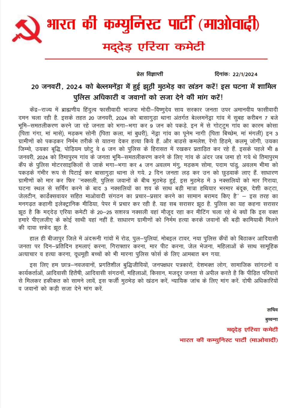 भोपालपट्नम, 22 जनवरी। माओवादी संगठन मद्देड एरिया कमेटी ने प्रेस नोट जारी कर बासागुड़ा के बेल्लमनेंड्रा गांव में हुई घटना को फर्जी बताया है।