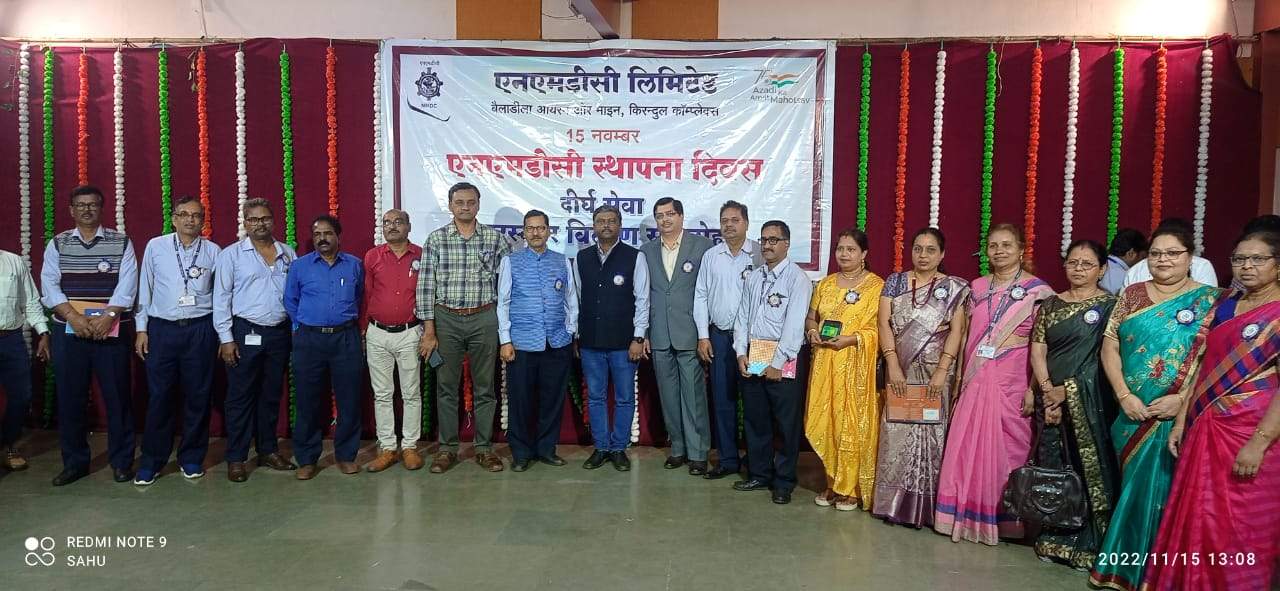 बचेली / किरंदुल, 16 नवंबर। एनएमडीसी के स्थापना दिवस के अवसर पर बीआईओपी किरंदुल सभागार में दीर्घ सेवा पुरस्कार वितरण समारोह का आयोजन किया गया।