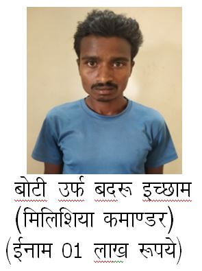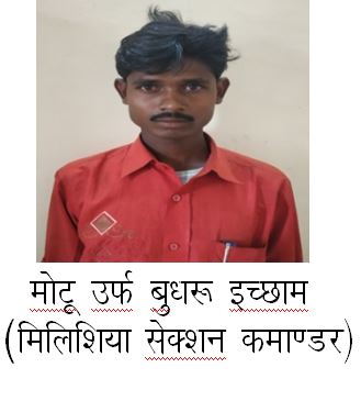 पकड़े गये संदिग्ध व्यक्तियों से पूछताछ करने पर अपना नाम बोटी उर्फ बदरू इच्छाम (28 वर्ष) हुर्रेपाल गायतापारा थाना मिरतुर हुर्रेपाल पंचायत मिलिशिया कमाण्डर(1 लाख ईनामी), लक्ष्मण हपका (25 वर्ष) एटेपाल पटेलपारा थाना मिरतुर हुर्रेपाल पंचायत डीएकेएमएस अध्यक्ष(1 लाख ईनामी) , मोटू उर्फ बुधरू इच्छाम (25 वर्ष) हुर्रेपाल स्कूलपारा थाना मिरतुर हुर्रेपाल पंचायत मिलिशिया सेक्शन कमाण्डर, सोनारू मडक़ाम (19 वर्ष) कोण्डापाल गहनारपारा थाना मिरतुर जिला बीजापुर ग्राम कोण्डापाल डीएकेएमएस सदस्य के पद पर कार्य करना एवं 26 नवंबर को भांसी क्षेत्र में निर्माण कार्य में लगे वाहनों को आगजनी करने की घटना में शामिल होना बताये।