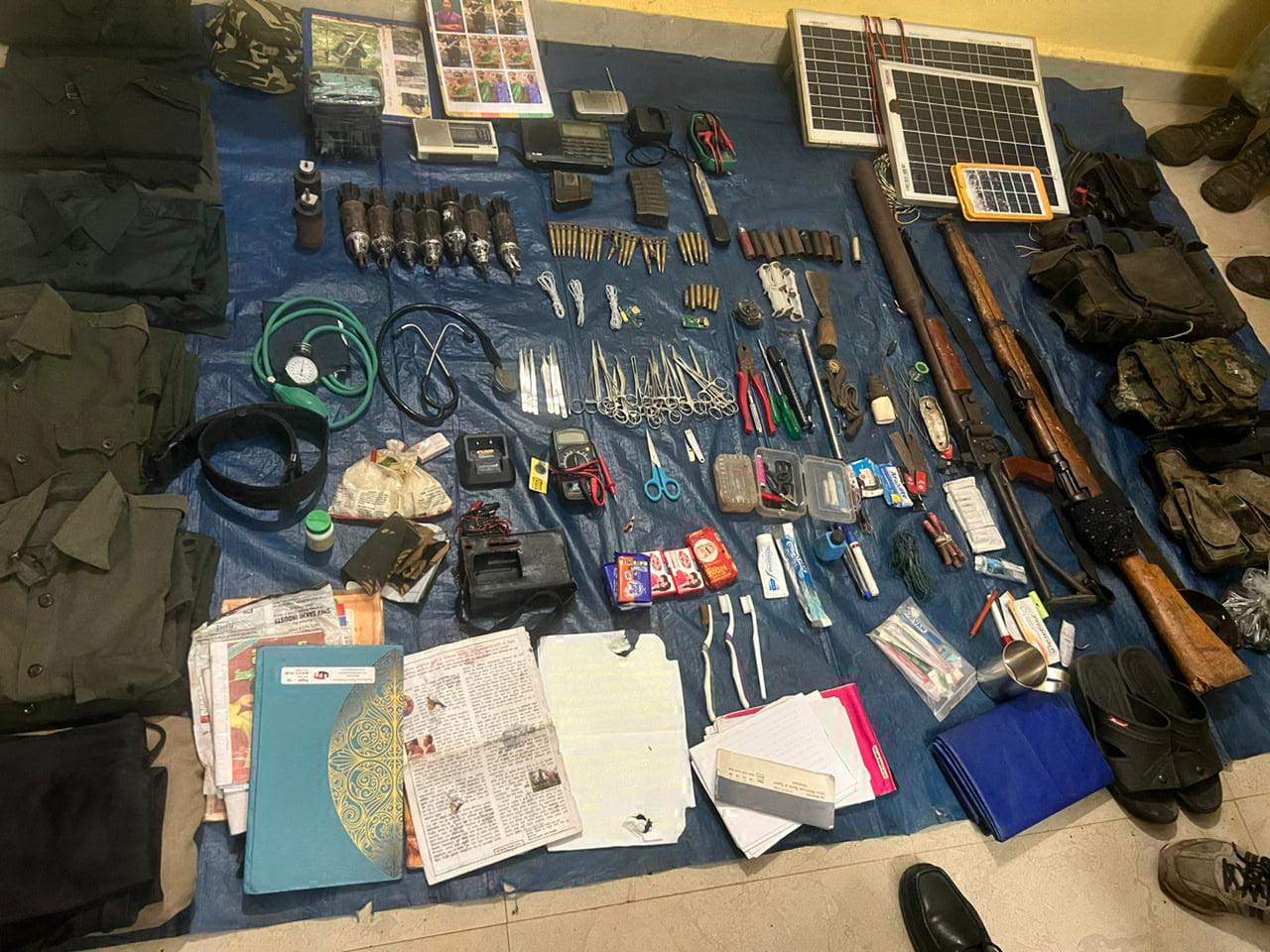 जवानों ने दो बंदूक, नक्सली साहित्य, सोलर पेनल, नक्सली वर्दी, मैगजीन, कारतूस, रेडियो, पि_ू, मेडिकल सामग्री, सहित नक्सली उपयोग की सामाग्री सहित अन्य सामान बरामद किया गया। संपूर्ण कार्रवाई में मयंक रणसिंह एसडीओपी नगरी, आरके मिश्रा, डीएसपी नक्स, ऑप्स नगरी डीआरजी धमतरी, डीआरजी गरियाबंद,सीएएफ की टीम रही शामिल।