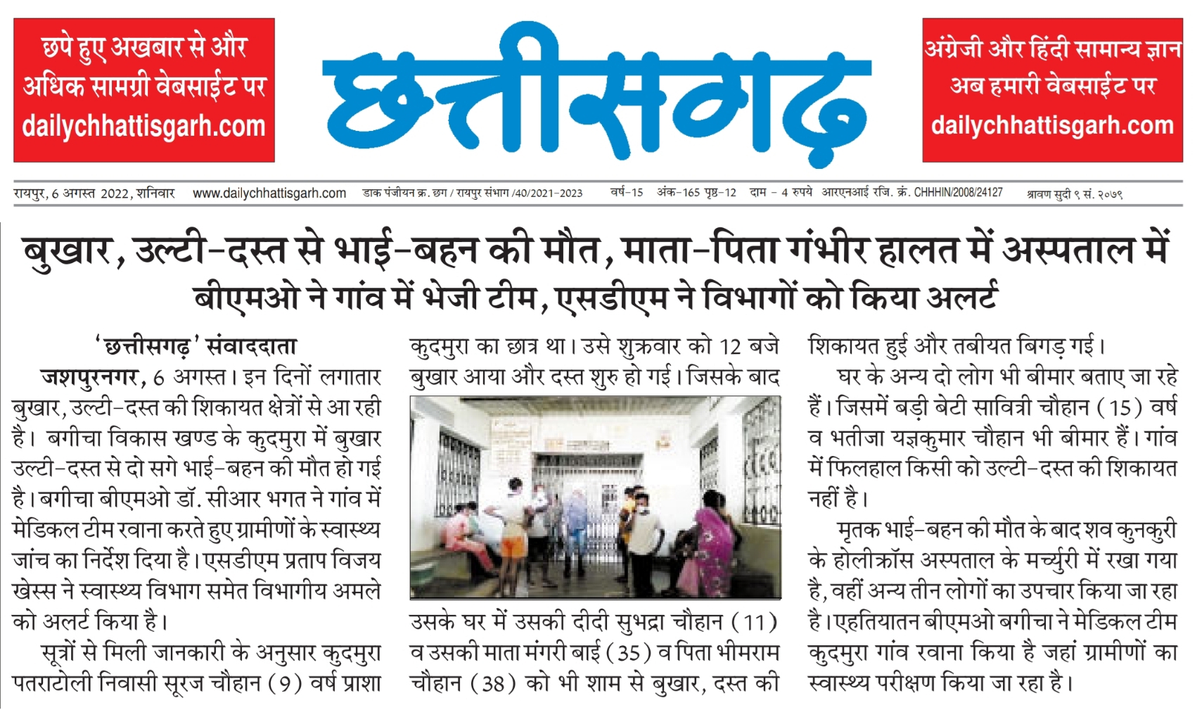 जशपुरनगर, 7 अगस्त। जिले के बगीचा जनपद पंचायत क्षेत्र के कुदमुरा पतराटोली से जहां पिछले 5 अगस्त को स्कूल में सूरज चौहान (9) वर्ष को बुखार के साथ दस्त की शिकायत हुई। जिसके बाद उसे घर भेज दिया गया। शाम तक उसकी बड़ी बहन सुभद्रा चौहान (11) वर्ष की भी तबियत बिगड़ गई। इस बीच उनकी मां रोजगार सचिव मंगरी बाई (35) के पास पैसे नहीं थे। उसने सोचा की कहीं से पैसे आ जाएं तो बच्चों को अगले दिन अस्पताल ले जाकर इलाज कराऊंगी, लेकिन इलाज के लिए उसने अपनी जिलाध्यक्ष शोभापति को फोन लगाई। देर शाम तक माता मंगरी बाई व पिता भीमराम चौहान समेत बड़ी बेटी सावित्री चौहान (15) की भी तबियत बिगड़ गई और बुखार उल्टी दस्त से पूरा परिवार पीडि़त हो गया।