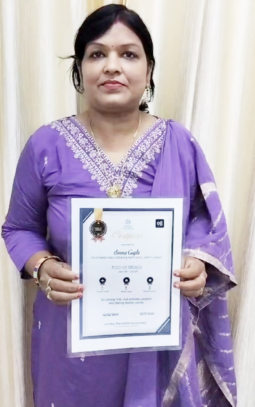 सम्मानित होने वाले शिक्षकों में रत्ना गुरु प्राथमिक शाला जामटोली, सीमा गुप्ता माध्यमिक शाला चराईडांड है। जुलाई माह में शिक्षकों ने अपने कार्यों और नवाचारी गतिविधियों को विनोबा एप में अपलोड किया था। विनोबा एप में अपलोड की गई गतिविधियों के विश्लेषण पश्चात उत्कृष्ट कार्य के लिए शिक्षकों को चयनित किया गया था। विनोबा एप की टीम जिले में शैक्षिक गुणवत्ता बढ़ाने के लिए एफएलएन, जवाहर नवोदय परीक्षा की तैयारी में सहयोग के साथ डाटा कलेक्शन का कार्य यशस्वी जशपुर के समन्वय में कर रही है।