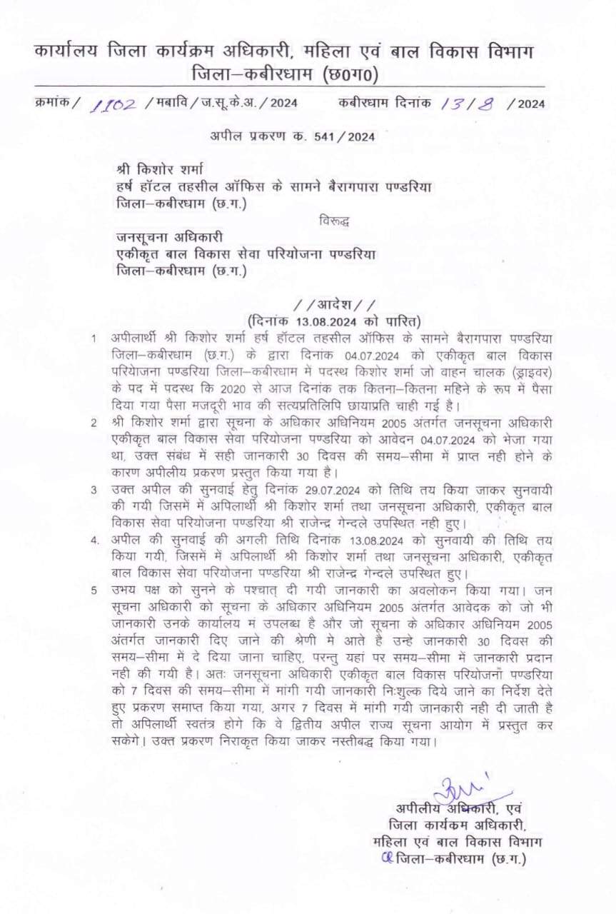 कार्यालय जिला कार्यक्रम अधिकारी, महिला एवं बाल विकास विभाग जिला-कबीरधाम क्रमांक / 1102 / मबावि/ज.सू.के.अ./2024 कबीरधाम 13अगस्त 2024 अपील प्रकरण क. 541/2024 में आदेश 13 अगस्त को सुनवाई की तिथि तय किया गई, जिसमें में अपिलार्थी किशोर शर्मा तथा जनसूचना अधिकारी, एकीकृत बाल विकास सेवा परियोजना पण्डरिया राजेन्द्र गेन्दले उपस्थित हुए। उभय पक्ष को सुनने के पश्चात् दी गयी जानकारी का अवलोकन किया गया।