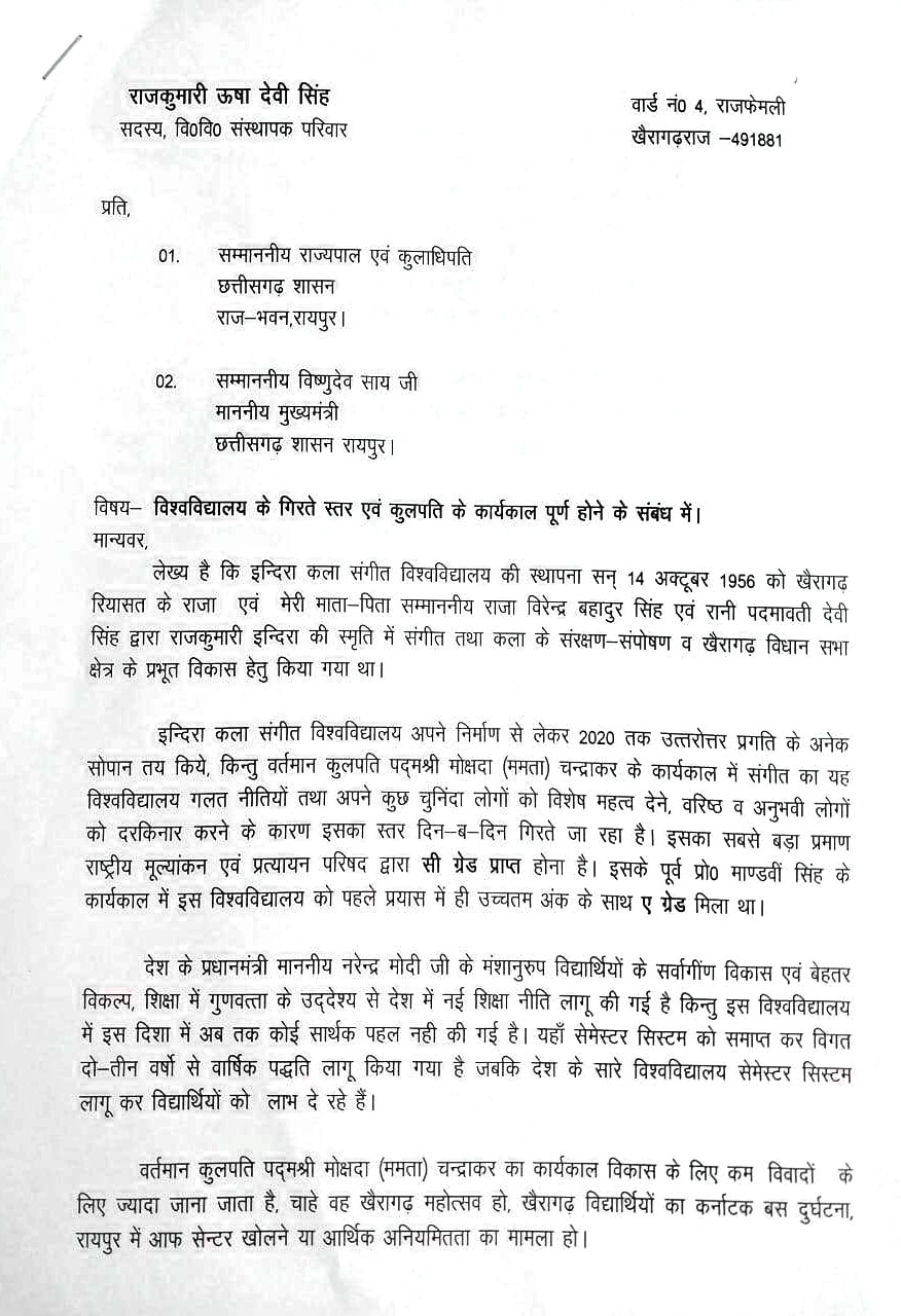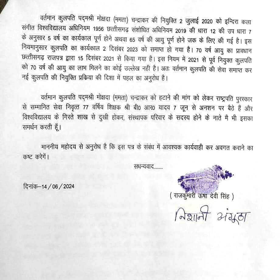 अपने पत्र में यह भी कहा है कि कुलपति मोक्षदा चंद्राकर की नियुक्ति 2 जुलाई 2020 को इंदिरा कला संगीत विश्वविद्यालय अधिनियम 1956 छत्तीसगढ़ संशोधित अधिनियम 2019 की धारा 12 की उप धारा 7 के अनुसार 5 वर्ष का कार्यकाल पूर्ण होने अथवा 65 वर्ष की आयु पूर्ण होने तक के लिए की गई है इस नियम के तहत 65 वर्ष की आयु पूर्ण कर लेने के कारण कुलपति का कार्यकाल 2 दिसंबर 2023 को समाप्त हो गया है।