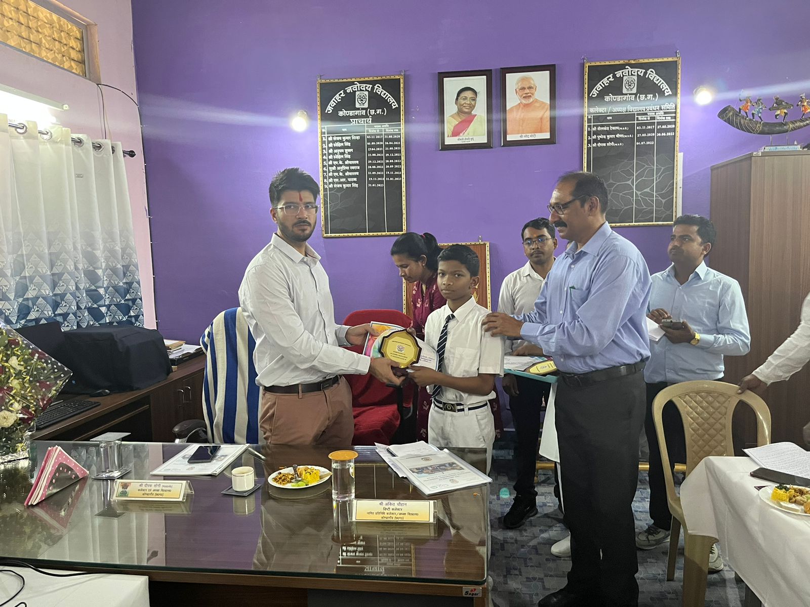 पीटीसी मेंबर शिवचरण साहू द्वारा कलेक्टर एवं डिप्टी कलेक्टर को पालकों की ओर से काष्ठ शिल्प भेंटकर अभिनंदन किया गया। बैठक एजेंडा में नवोदय विद्यालय के स्थाई प्रांगण निर्माण बच्चों के स्वास्थ्य संबंधी समस्याओं के निदान हेतु चिकित्सक सुविधा अस्थाई भवन की शेड की मरम्मत नगर पालिका से पेयजल सुविधा खेल सामग्री एवं भौतिक संसाधन की व्यवस्था पर चर्चा करते हुए संबंधित विभाग के अधिकारियों को निर्देशित किया गया।