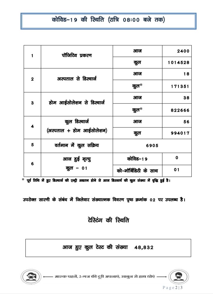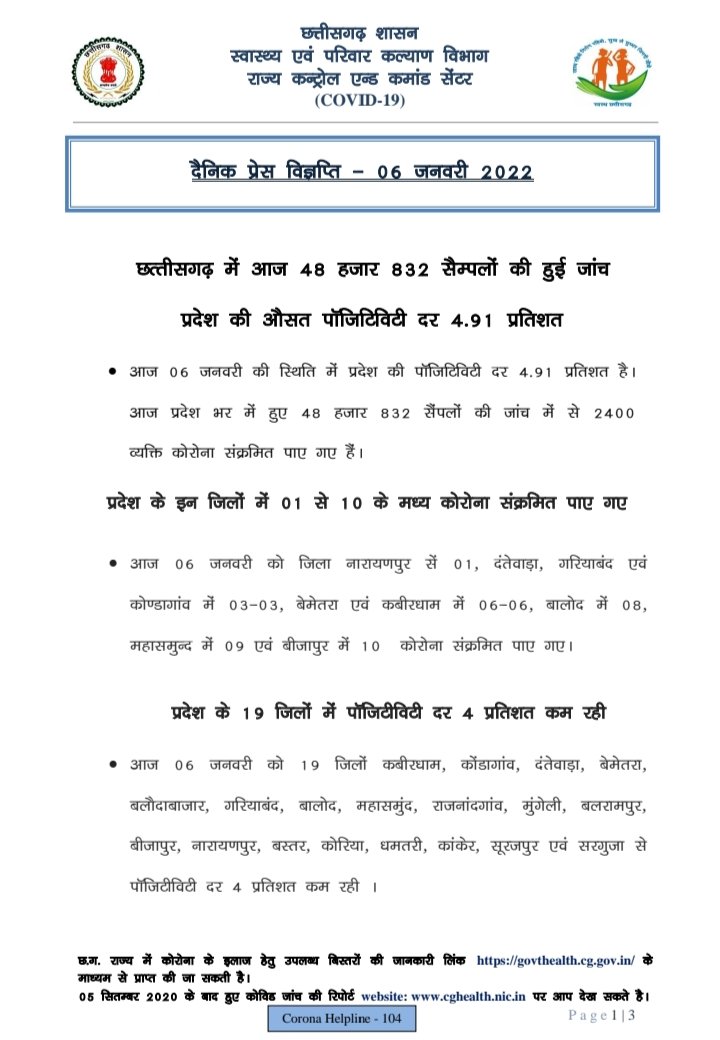 रायपुर, 6 जनवरी। राज्य में आज रात 09.00 बजे तक 2400 कोरोना पॉजिटिव मिले हैं। इनमें सबसे अधिक 752 रायपुर जिले से हैं। राज्य के स्वास्थ्य विभाग के इन आंकड़ों के मुताबिक आज रात तक किसी भी जिले में 800 से अधिक कोरोना पॉजिटिव नहीं मिले हैं। वहीं आज लगातार दूसरे दिन कोरोना डेढ़ गुना हो गया। कल कुल 1615 पॉजिटिव मिले थे।