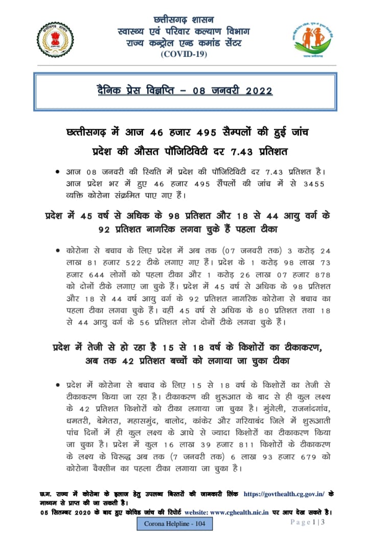 रायपुर, 8 जनवरी। राज्य में आज रात 08.30 बजे तक 3455 कोरोना पॉजिटिव मिले हैं। इनमें सबसे अधिक 1024 रायपुर जिले से हैं। राज्य के स्वास्थ्य विभाग के इन आंकड़ों के मुताबिक आज रात तक किसी भी जिले में 1050 से अधिक कोरोना पॉजिटिव नहीं मिले हैं। छत्तीसगढ़ में लगातार कोरोना की रफ्तार जारी है।