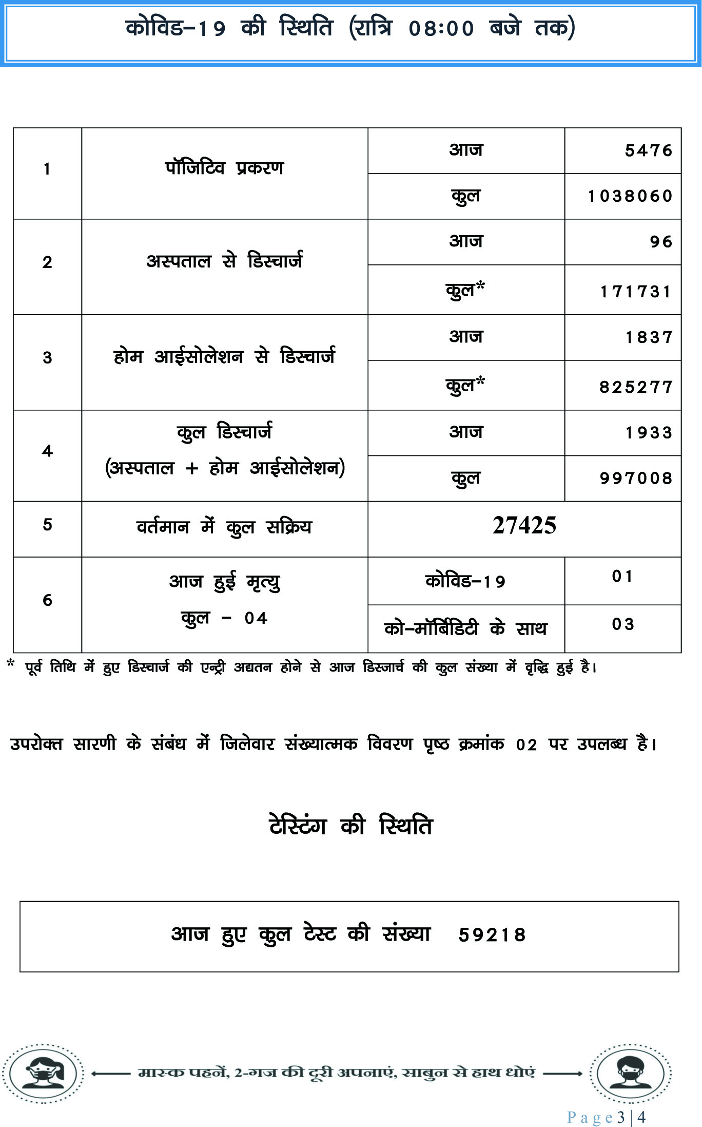 प्रदेश में आज 5476 पॉजिटिव, सर्वाधिक रायपुर जिले में, कुल मौतें 4