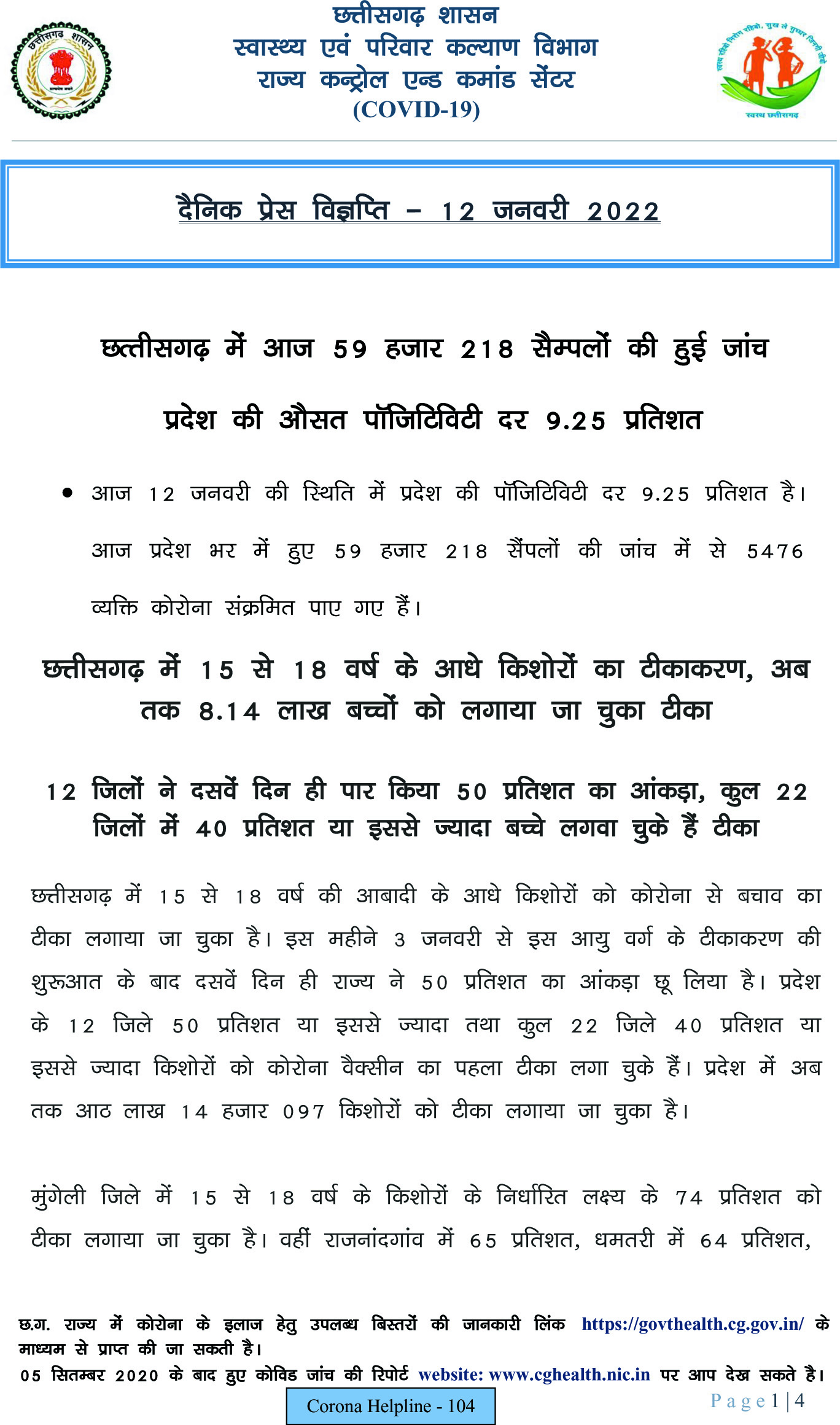 रायपुर, 12 जनवरी। राज्य में आज रात 09.00 बजे तक 5476 कोरोना पॉजिटिव मिले हैं। इनमें सबसे अधिक 1785 रायपुर जिले से हैं। राज्य के स्वास्थ्य विभाग के इन आंकड़ों के मुताबिक आज रात तक किसी भी जिले में 1800 से अधिक कोरोना पॉजिटिव नहीं मिले हैं।