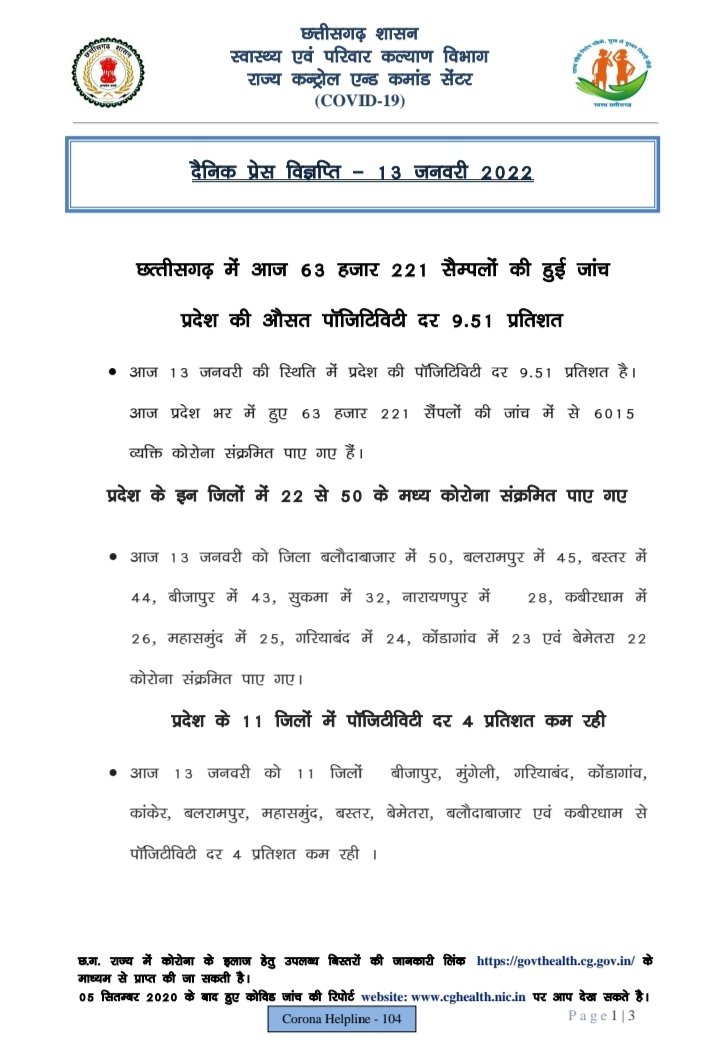 रायपुर, 13 जनवरी। राज्य में आज रात 09.00 बजे तक 6015 कोरोना पॉजिटिव मिले हैं। इनमें सबसे अधिक 2020 रायपुर जिले से हैं। राज्य के स्वास्थ्य विभाग के इन आंकड़ों के मुताबिक आज रात तक किसी भी जिले में 2050 से अधिक कोरोना पॉजिटिव नहीं मिले हैं।
