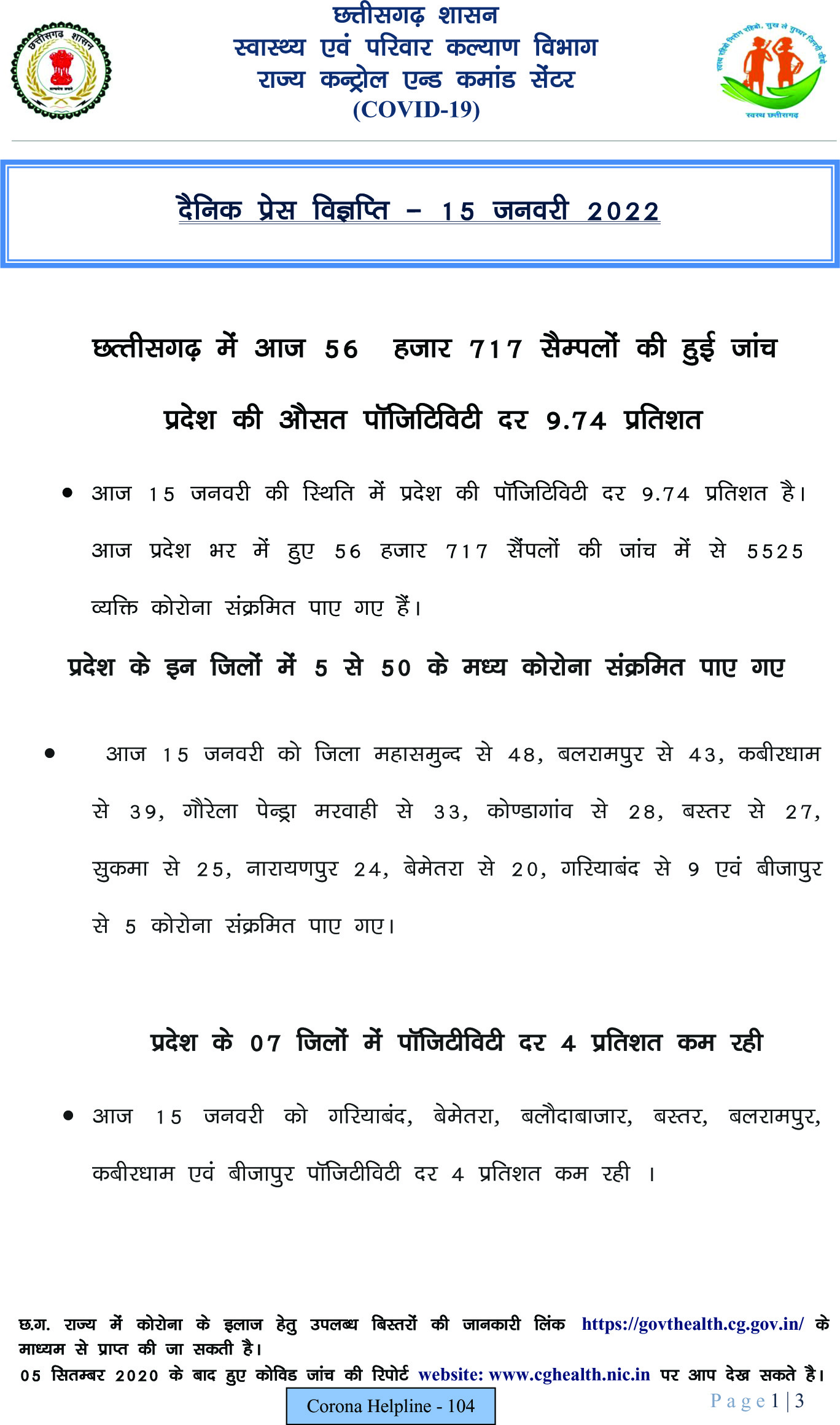 राज्य में आज रात 09.00 बजे तक 5525 कोरोना पॉजिटिव मिले हैं। इनमें सबसे अधिक 1692 रायपुर जिले से हैं। राज्य के स्वास्थ्य विभाग के इन आंकड़ों के मुताबिक आज रात तक किसी भी जिले में 1700 से अधिक कोरोना पॉजिटिव नहीं मिले हैं।