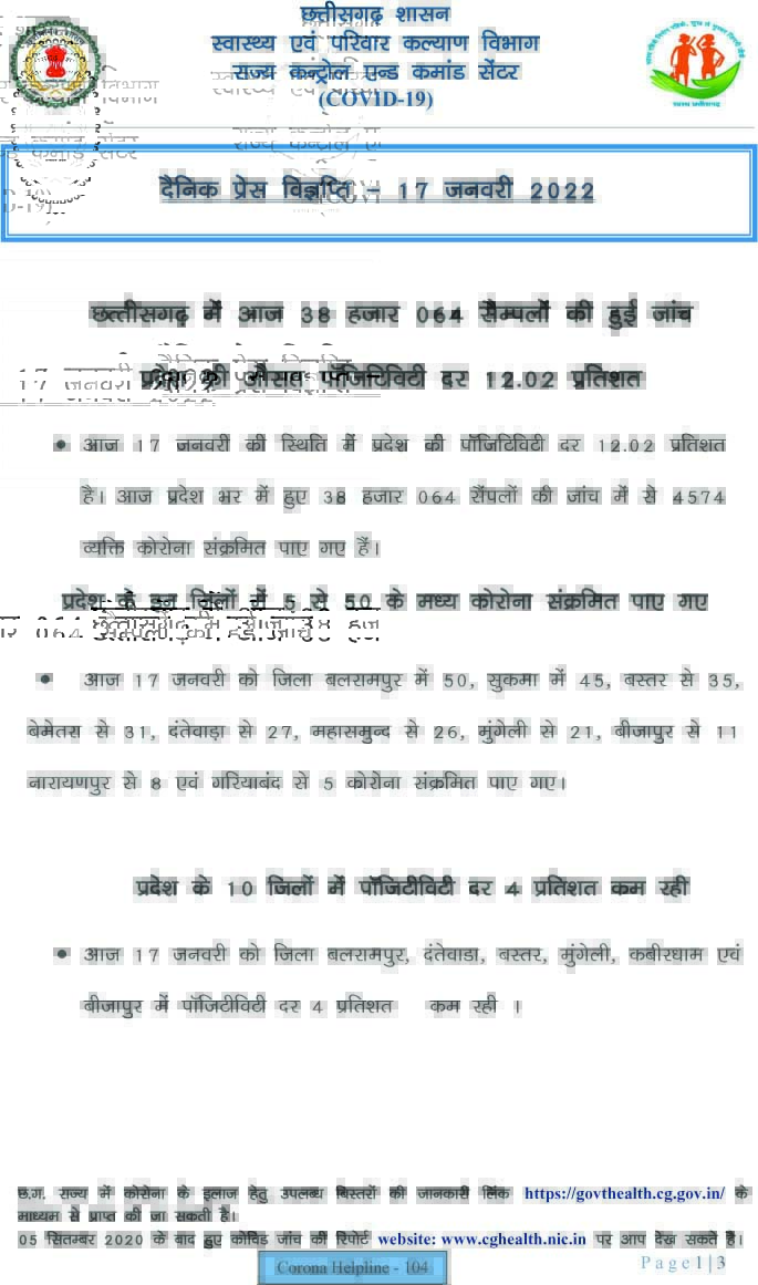 रायपुर, 17 जनवरी। राज्य में आज रात 09.00 बजे तक 4574 कोरोना पॉजिटिव मिले हैं। इनमें सबसे अधिक 1208 रायपुर जिले से हैं। राज्य के स्वास्थ्य विभाग के इन आंकड़ों के मुताबिक आज रात तक किसी भी जिले में 1220 से अधिक कोरोना पॉजिटिव नहीं मिले हैं।