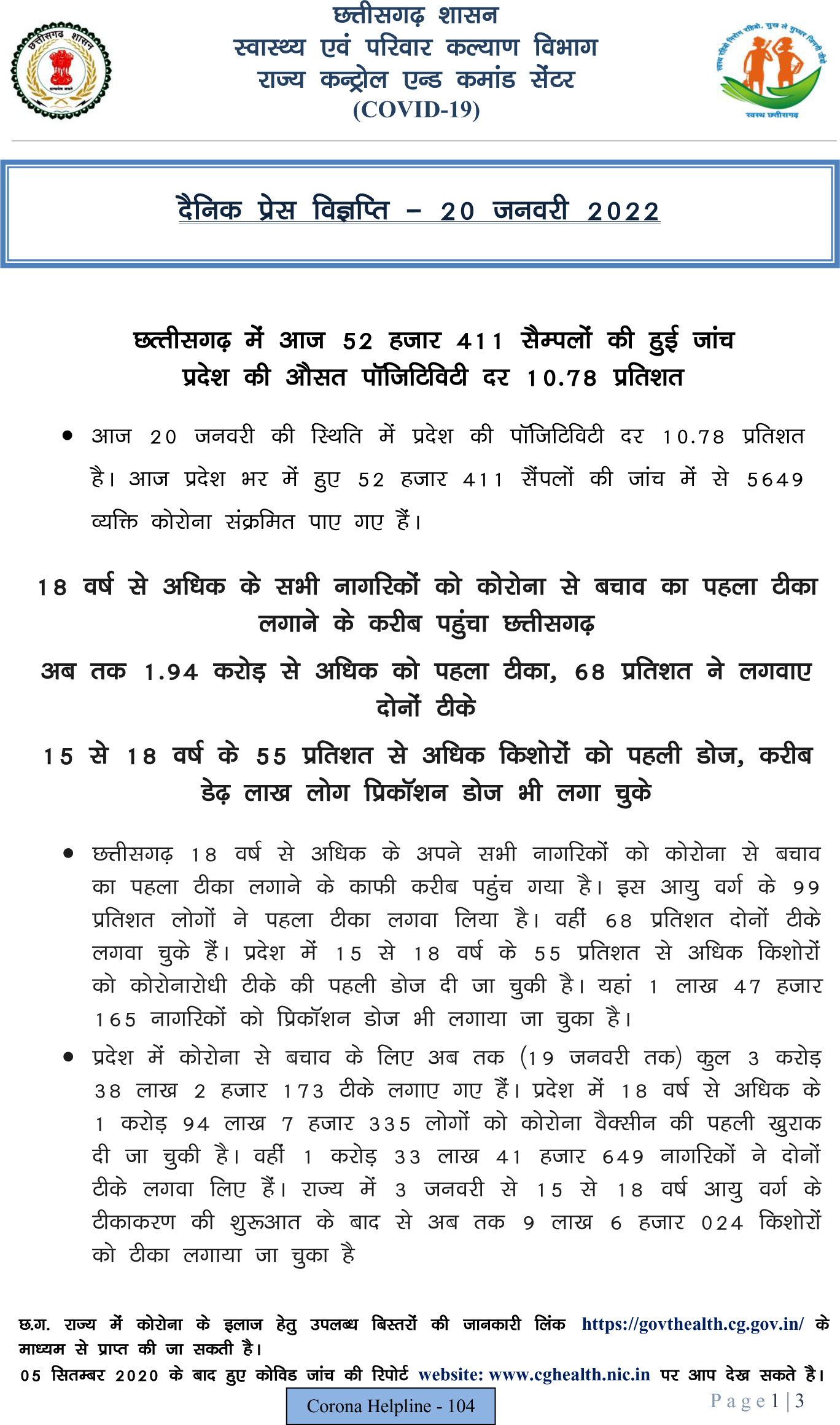 राज्य शासन के स्वास्थ्य विभाग के आंकड़ों के मुताबिक दुर्ग 1053, राजनांदगांव 334, बालोद 61, बेमेतरा 37, कबीरधाम 35, रायपुर 1442, धमतरी 132, बलौदाबाजार 99, महासमुंद 70, गरियाबंद 45, बिलासपुर 256, रायगढ़ 413, कोरबा 267, जांजगीर-चांपा 207, मुंगेली 66, जीपीएम 60, सरगुजा 129, कोरिया 131, सूरजपुर 129, बलरामपुर 18, जशपुर 187, बस्तर 156, कोंडागांव 54, दंतेवाड़ा 51, सुकमा 21, कांकेर 127, नारायणपुर 92, बीजापुर 32, अन्य राज्य 0 कोरोना पॉजिटिव मिले हैं।