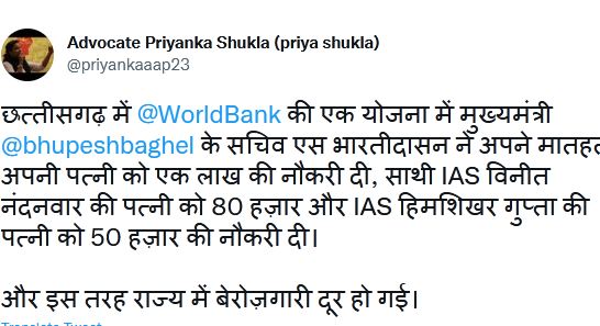 सोशल मीडिया में दोनों का ऑफर लेटर वायरल हुआ है। दोनों के अलावा एक और आईएएस अफसर विनीत नंदनवार की पत्नी कोमल नंदनवार को भी इसी प्रोजेक्ट में रखे जाने की खबर भी आई है। हाईकोर्ट की वकील, और सामाजिक कार्यकर्ता प्रियंका शुक्ला ने इन नियुक्तियों को लेकर ट्विटर पर कटाक्ष किए थे। भाजपा नेताओं ने भी इन नियुक्तियों को लेकर सरकार पर निशाना साधा है। कुछ लोगों ने इसके खिलाफ अदालत का दरवाजा खटखटाने की तैयारी भी कर ली थी।
