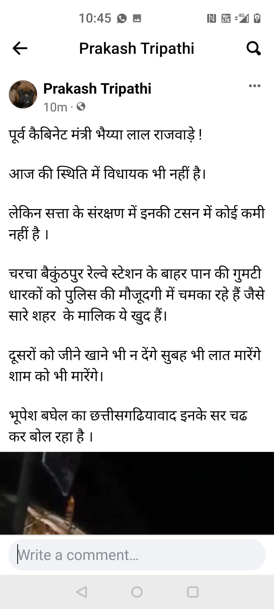 सामाजिक कार्यकर्ता प्रकाश त्रिपाठी फेसबुक पर वायरल वीडियो शेयर कर लिखते हैं कि पूर्व कैबिनेट मंत्री भैय्या लाल राजवाड़े! आज की स्थिति में विधायक भी नहीं है। लेकिन सत्ता के संरक्षण में इनकी टसन में कोई कमी नहीं है। चरचा बैकुंठपुर रेल्वे स्टेशन के बाहर पान की गुमटी धारकों को पुलिस की मौजूदगी में चमका रहे हैं जैसे सारे शहर के मालिक ये खुद हैं।