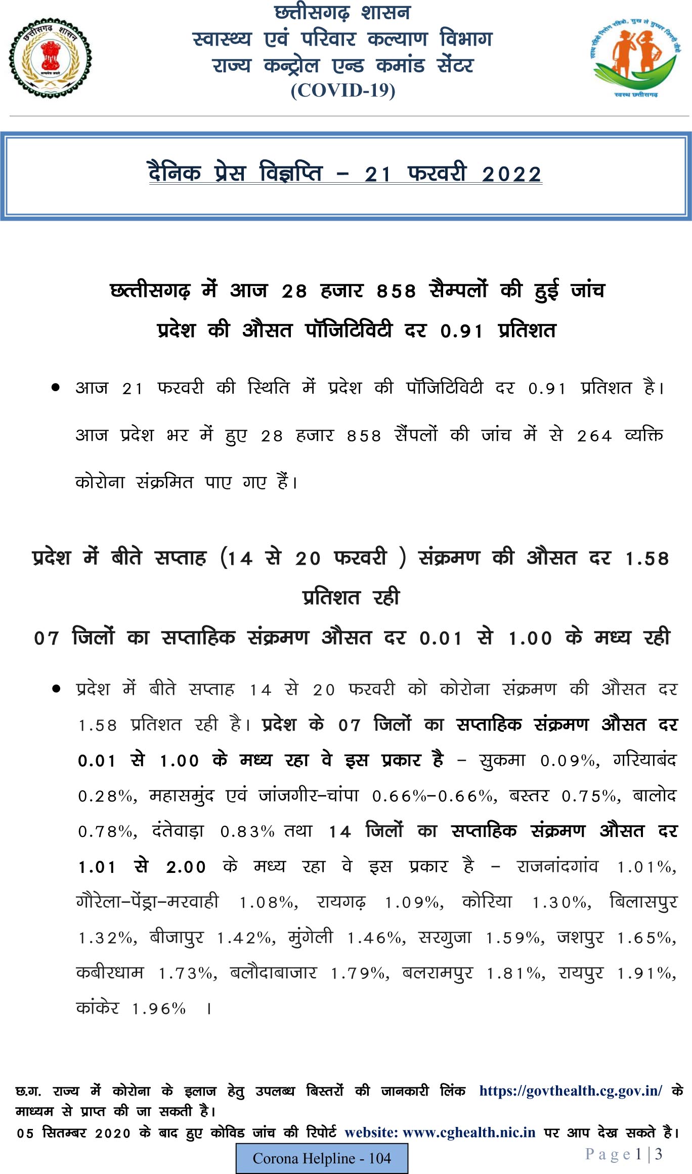 प्रदेश में आज रात तक 264 पॉजिटिव, सर्वाधिक बेमेतरा जिले में, 4 जिलों में शून्य