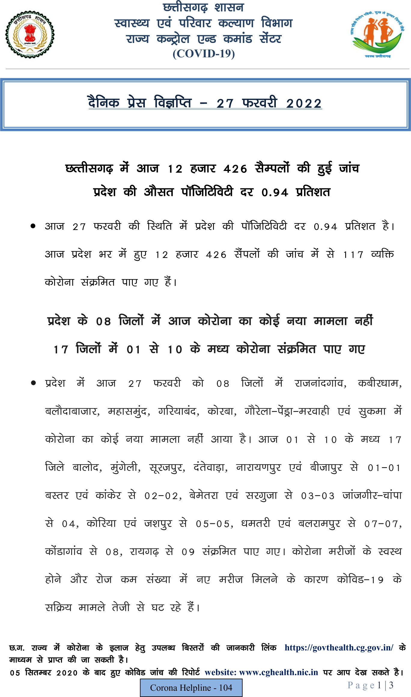 प्रदेश में आज रात तक 117 पॉजिटिव, सर्वाधिक रायपुर जिले में, 8 जिलों में शून्य
