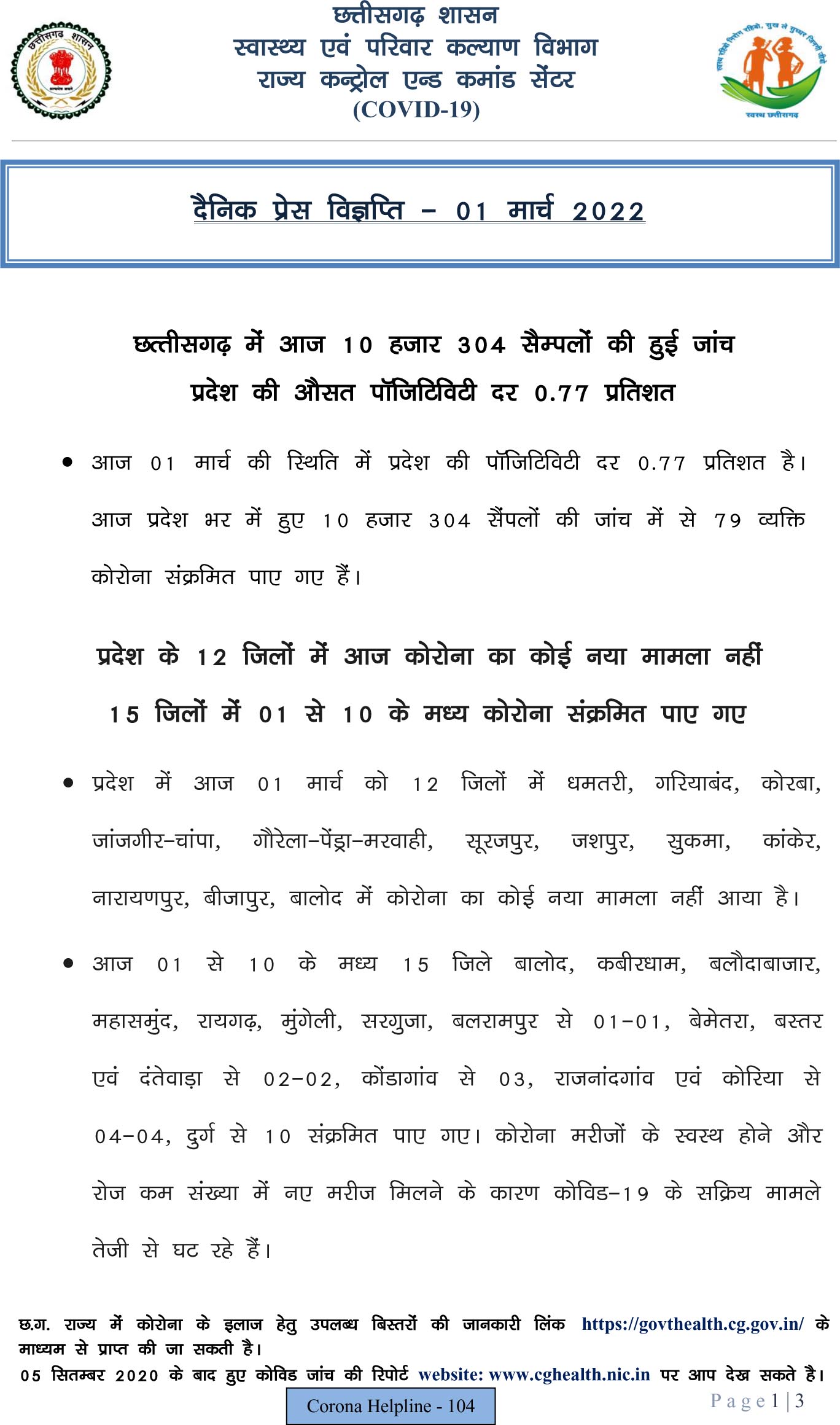 प्रदेश में आज रात तक 79 पॉजिटिव, सर्वाधिक रायपुर जिले में, 11 जिलों में शून्य