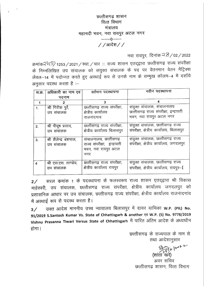 रायपुर, 2 मार्च। राज्य संपरीक्षा के 15 अफसरों की पदोन्नति हुई है। इस कड़ी में दो संयुक्त संचालक, उपसंचालक, और सहायक संचालक अफसर पदोन्नत हुए हैं। पदोन्नति के साथ-साथ उनकी पदास्थापना आदेश जारी कर दिए गए हैं।