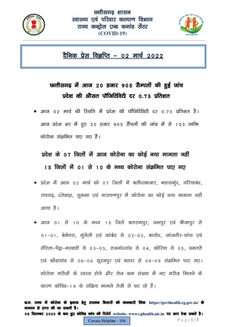 प्रदेश में आज रात तक 153 पॉजिटिव, सर्वाधिक बिलासपुर जिले में, 7 जिलों में शून्य