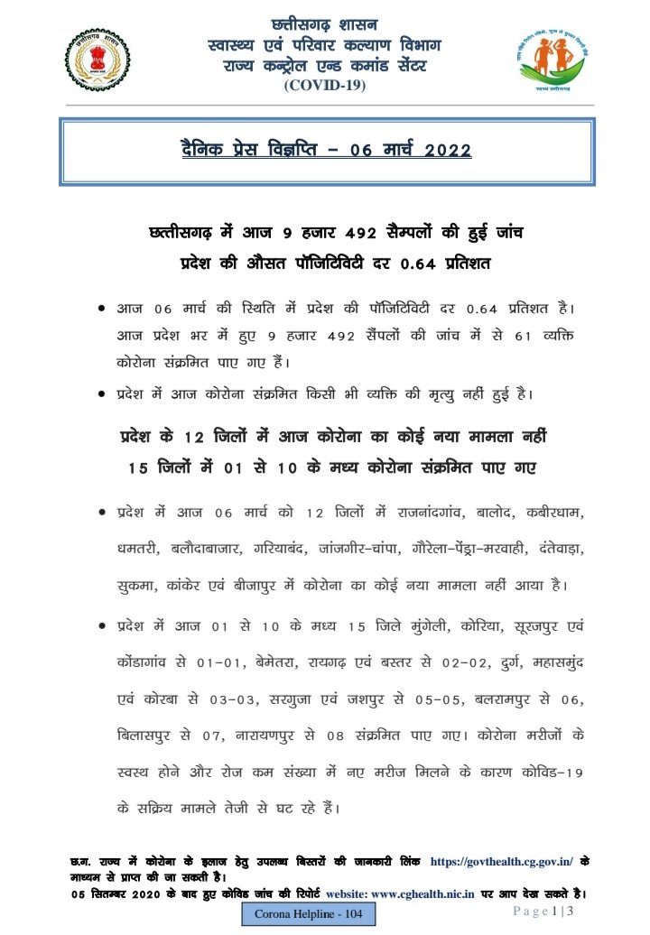 रायपुर, 6 मार्च। राज्य में आज रात 09.00 बजे तक 61 कोरोना पॉजिटिव मिले हैं। इनमें सबसे अधिक 11 रायपुर जिले से हैं। राज्य के स्वास्थ्य विभाग के इन आंकड़ों के मुताबिक आज रात तक किसी भी जिले में 20 से अधिक कोरोना पॉजिटिव नहीं मिले हैं। आज कुल 12 जिलों को एक भी पॉजिटिव नहीं मिले हैं।