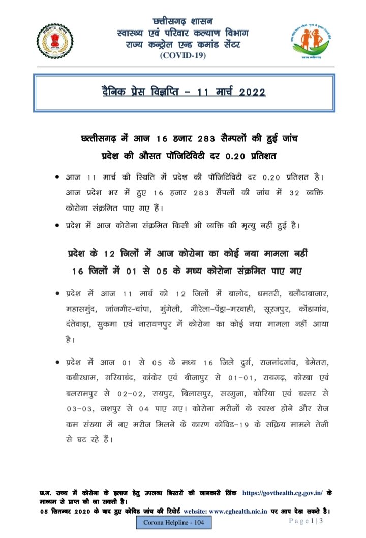 रायपुर, 11 मार्च। राज्य में आज रात 09.00 बजे तक 32 कोरोना पॉजिटिव मिले हैं। इनमें सबसे अधिक 4 जशपुर जिले से हैं। राज्य के स्वास्थ्य विभाग के इन आंकड़ों के मुताबिक आज रात तक किसी भी जिले में 10 से अधिक कोरोना पॉजिटिव नहीं मिले हैं। आज कुल 12 जिलों को एक भी पॉजिटिव नहीं मिले हैं।
