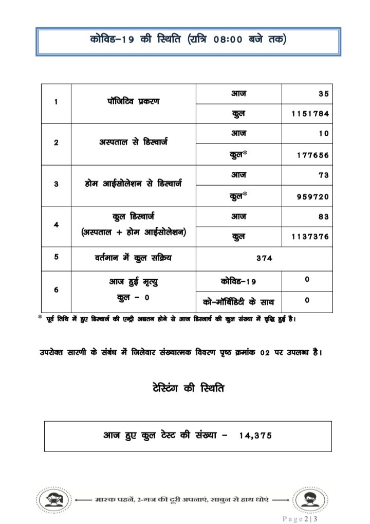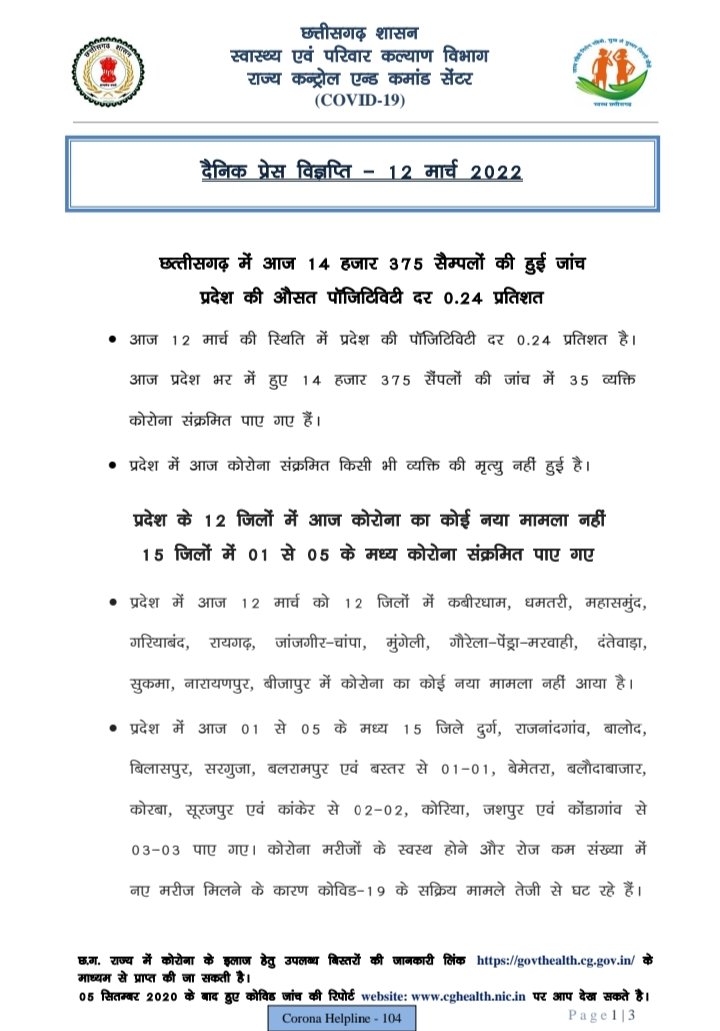 प्रदेश में आज रात तक 35 पॉजिटिव, सर्वाधिक रायपुर जिले में, 12 जिलों में शून्य