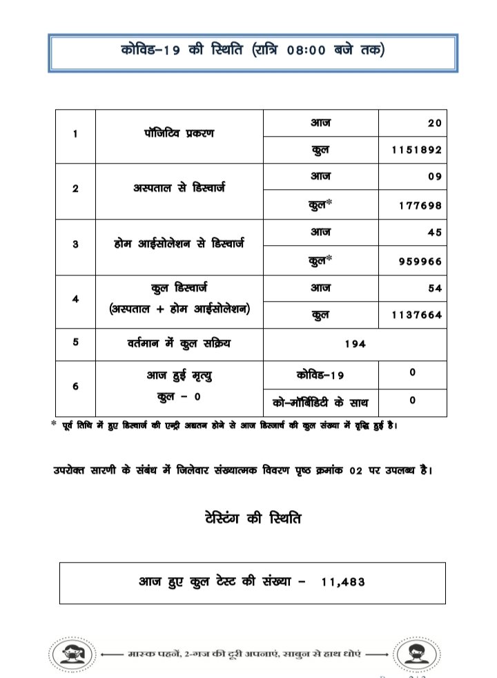 प्रदेश में आज रात तक 20 पॉजिटिव, सर्वाधिक रायगढ़ जिले में, 15 जिलों में शून्य
