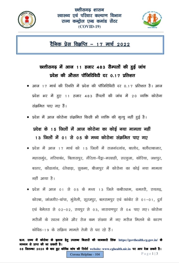 रायपुर, 17 मार्च। राज्य में आज रात 09.00 बजे तक 20 कोरोना पॉजिटिव मिले हैं। इनमें सबसे अधिक 6 नारायणपुर जिले से हैं। राज्य के स्वास्थ्य विभाग के इन आंकड़ों के मुताबिक आज रात तक किसी भी जिले में 10 से अधिक कोरोना पॉजिटिव नहीं मिले हैं। आज कुल 15 जिलों को एक भी पॉजिटिव नहीं मिले हैं।