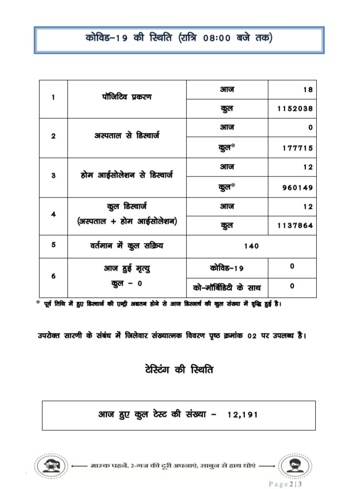 प्रदेश में आज रात तक 18 पॉजिटिव, सर्वाधिक जशपुर जिले में, 17 जिलों में शून्य