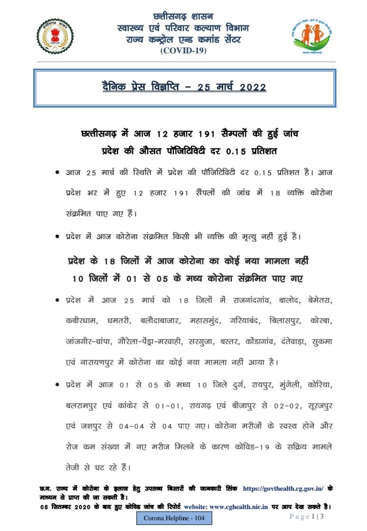 राज्य में आज रात 09.00 बजे तक 18 कोरोना पॉजिटिव मिले हैं। इनमें सबसे अधिक 4-4 जशपुर और सूरजपुर जिलों से हैं। राज्य के स्वास्थ्य विभाग के इन आंकड़ों के मुताबिक आज रात तक किसी भी जिले में 10 से अधिक कोरोना पॉजिटिव नहीं मिले हैं। आज कुल 17 जिलों को एक भी पॉजिटिव नहीं मिले हैं।