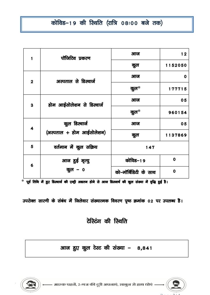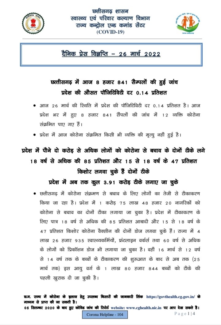 प्रदेश में आज रात तक 12 पॉजिटिव, सर्वाधिक सरगुजा जिले में, 22 जिलों में शून्य