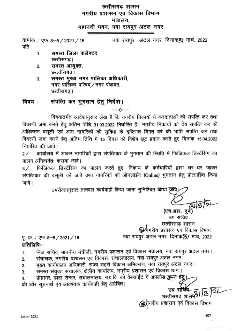 नगरीय निकायों में सम्पत्ति कर एवं विवरणी जमा करने  की अंतिम तिथि में 15 दिन की विशेष छूट दी गई।
