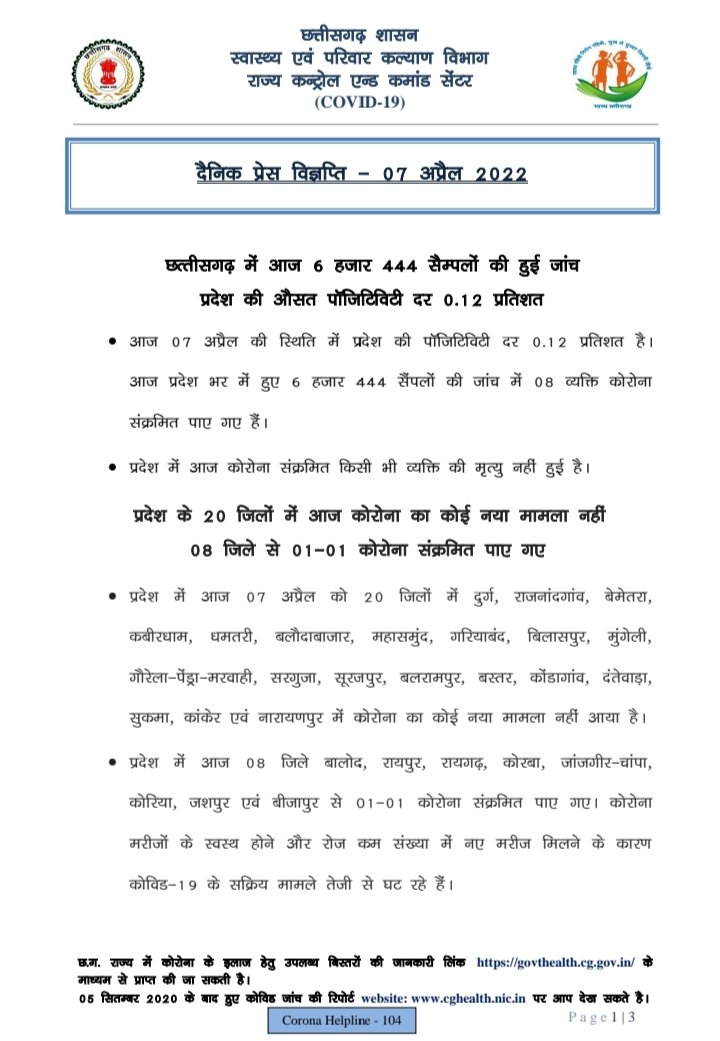 राज्य में आज रात 09.00 बजे तक 8 कोरोना पॉजिटिव मिले हैं। राज्य के स्वास्थ्य विभाग के इन आंकड़ों के मुताबिक आज रात तक किसी भी जिले में 5 से अधिक कोरोना पॉजिटिव नहीं मिले हैं। आज कुल 20 जिलों मेें एक भी पॉजिटिव नहीं मिले हैं।