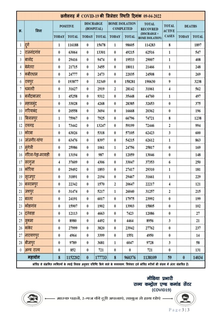 राज्य शासन के स्वास्थ्य विभाग के आंकड़ों के मुताबिक दुर्ग 1, राजनांदगांव 0, बालोद 0, बेमेतरा 0, कबीरधाम 0, रायपुर 0, धमतरी 0, बलौदाबाजार 1, महासमुंद 0, गरियाबंद 0, बिलासपुर 1, रायगढ़ 1, कोरबा 0, जांजगीर-चांपा 0, मुंगेली 0, जीपीएम 0, सरगुजा 4, कोरिया 0, सूरजपुर 0, बलरामपुर 0, जशपुर 0, बस्तर 0, कोंडागांव 0, दंतेवाड़ा 0, सुकमा 0, कांकेर 0, नारायणपुर 0, बीजापुर 0, अन्य राज्य 0 कोरोना पॉजिटिव मिले हैं।