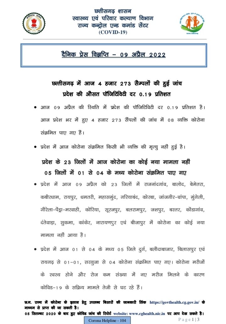 रायपुर, 9 अप्रैल। राज्य में आज रात 09.00 बजे तक 8 कोरोना पॉजिटिव मिले हैं। इनमें सबसे अधिक 4 सरगुजा जिले से हैं। राज्य के स्वास्थ्य विभाग के इन आंकड़ों के मुताबिक आज रात तक किसी भी जिले में 5 से अधिक कोरोना पॉजिटिव नहीं मिले हैं। आज कुल 24 जिलों मेें एक भी पॉजिटिव नहीं मिले हैं।